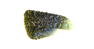Moldavite is a natural glass. It has a unique formation at the back of it. Moldavite is technically a Tektite, a collection of effect glasses formed by meteorite effects.