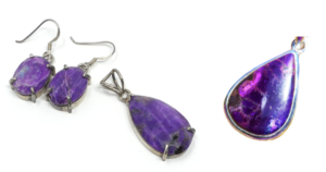 Sugilite is best used in pendants, earrings, brooches, and other pieces that are not subject to impact or abrasion due to its Mohs hardness range of 5.5 to 6.5. Sugilite should be in a mounting that shields it from damage when used in rings and bracelets.